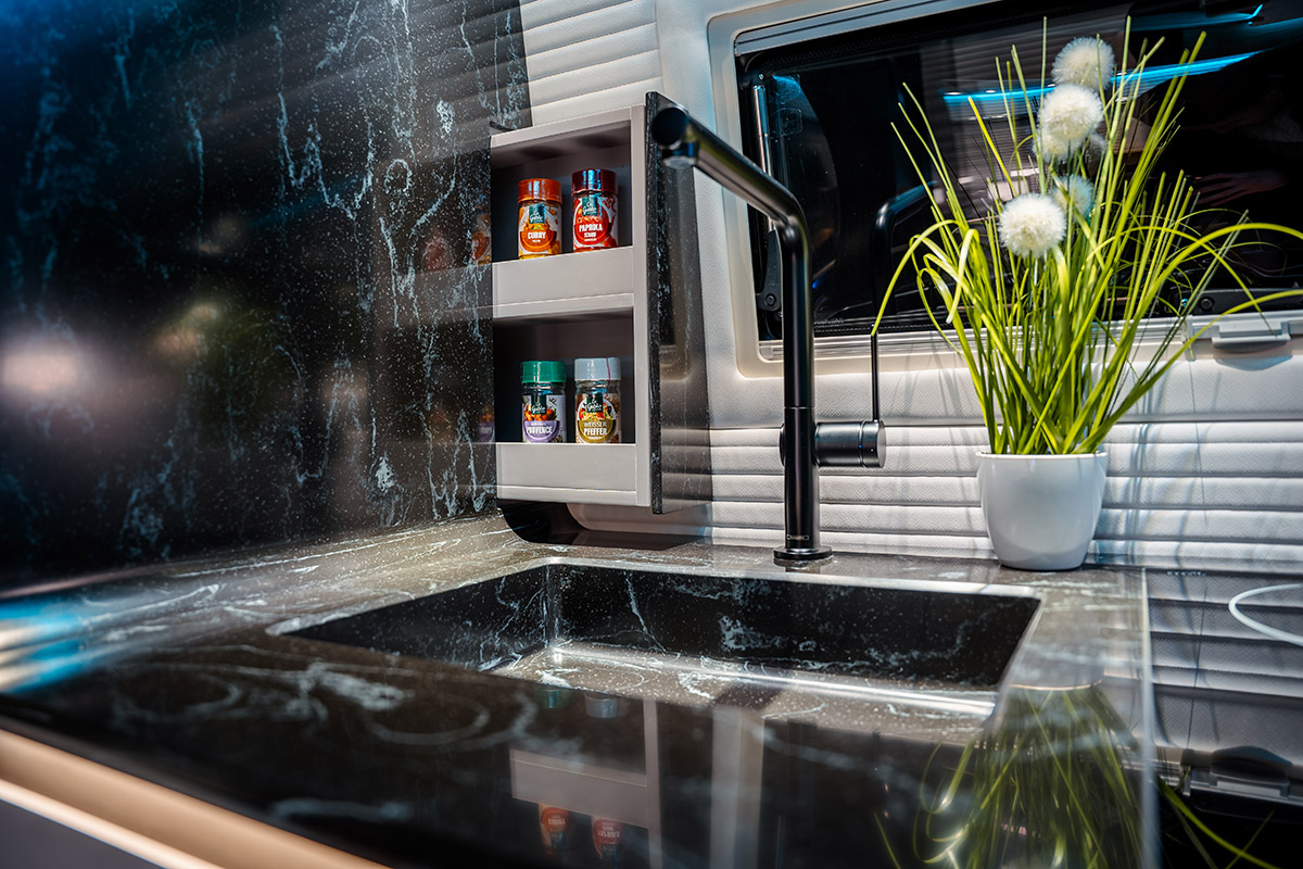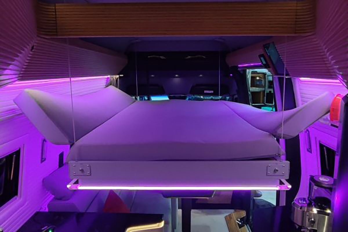 In the vehicle, you will not find a classic bed, but a lift-up bed that adapts to the roof of the Mercedes over the middle part of the vehicle. Its special feature is that it is the only series-produced bed that moves electrically vertically and extends electrically horizontally to the desired dimensions of length 200 cm and width 160 cm. In addition, the bed is also “floating,” which means that it is attached to the ceiling structure of the vehicle only with four point steel cables without additional guides or supports.