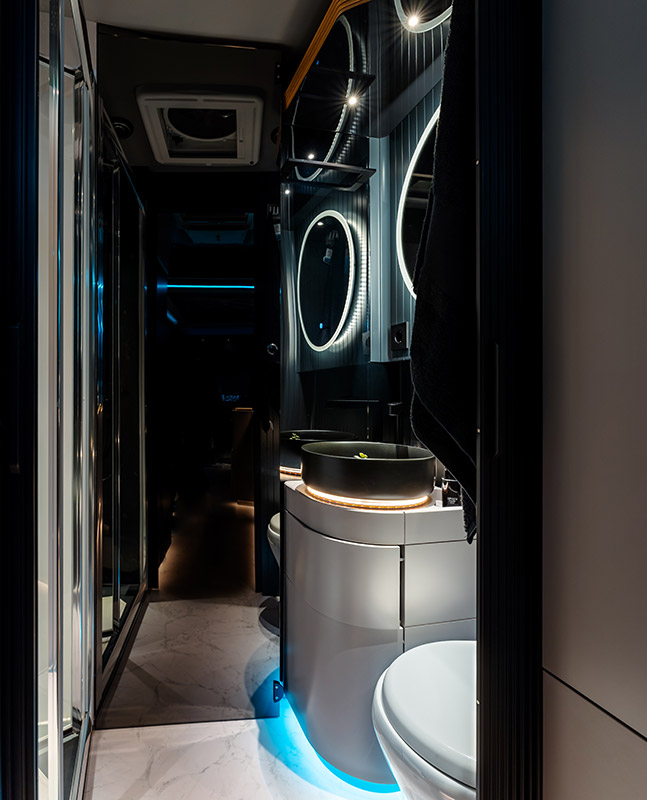 Despite the limited space, the bathroom is surprisingly large. It stands out with its practicality and luxurious touch. It has a private shower with a glass partition, a black sink, a ceramic toilet and a large illuminated mirror.